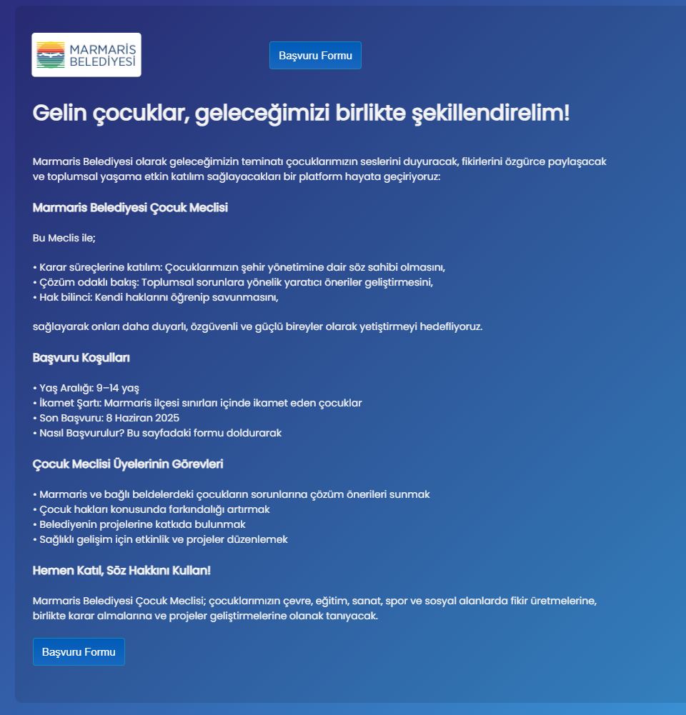 Marmaris Belediyesi Çocuk Meclisi için başvurular başladı. 9-14 yaş aralığındaki çocuklara çağrıda bulunan Başkan Acar Ünlü, “Hepinizi bu meclisin bir parçası olmaya davet ediyorum. Gelin, kentimizi birlikte yönetelim” ifadesini kullandı. Marmaris Belediyesi, ilçede ikamet eden çocukların toplumsal hayata aktif olarak katılımını sağlamak ve onları demokratik süreçlerle tanıştırmak amacıyla Çocuk Meclisi kurulması yönünde çalışma başlattı. Marmaris Belediye Meclisi’nde de oy birliği ile geçen çocuk meclisiyle ilgili başvurular da başladı. Buna göre Marmaris’te ikamet eden 9-14 yaş aralığındaki çocuklar, kent yönetimine dair fikirlerini ifade edebilecek, çeşitli projeler geliştirecek ve toplumsal konulara çözüm odaklı yaklaşımlar sunabilecek. Meclise katılmak isteyen çocuklar 8 Haziran 2025 tarihine kadar https://cocukmeclisi.marmaris.bel.tr/ adresinden başvuru yapabilecek.